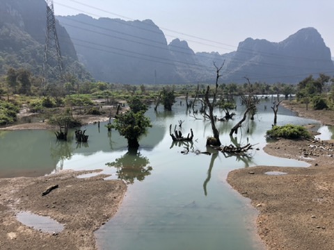 Dingding, réveil 7h, mais ici en Asie le 7h du matin n'est pas le même qu'en France car le soleil se couche à 18h et se lève à 5h donc notre horloge biologique se règle facilement sur le soleil. Petit déjeuner pris, nous reprenons la route avec nos super bolides. Nous nous rendons bien compte a la lumière du jour que Talang est une ville entourée d'un grand lac artificiel où des arbres blancs tiennent debout on ne sait comment. Pour la journée une fois encore nous gardons le même esprit que la veille : pas de grottes. Sur ce long trajet il n'y a pas 36.000 choses à faire mis à part un lieu nommé la "Cool Spring", vu un nom comme ça il faut y faire un tour ! L'entré est un peu cher (pour le Laos) 2€, mais nous avons programmé d'y passer toute l'après midi, l'entrée sera donc vite rentabilisée. Il s'agit d'un petit bassin bleu turquoise où l'on peu s'y baigner et après se reposer sur l'herbe. Je n'avais pas fait la crêpe depuis bien longtemps, donc j'apprécie prendre mon temps et ne rien faire. Je pense que c'est important de prendre des moments de repos comme ça pour pouvoir apprécier les moments de visites un peu plus chargés.