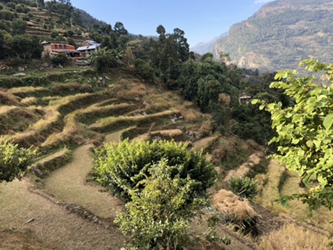 Ce matin le paysage est déjà complètement différent, nous passons par des sentiers qui traversent les forêts humides, on observe même du verglas au bord des chemins, nous montons beaucoup d’escaliers, il faut s’appuyer et faire confiance à ses cuisses, je n’ai pas compté les marches mais je sais qu’il y en a eu pas mal. Se dessine au fur et à mesure de notre route le mont Annapurna II (7937m d’altitude) son sommet est tout enneigé et rayonne avec le soleil qui l’éclaire.