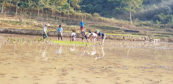Puis il est temps de reprendre la route et nous remontons sur le bateau pour aller sur une rive un peu plus loin. Et c'est repartit pour de la marche, en chemin nous faisons connaissance avec Oudan, il est très drôle et parle quelques mots de français nous essayons donc d'apprendre le Laotien, mais ce n'est pas gagné ! Nous passons par beaucoup de champs en terrasses et puis peu à peu découvrons des rizières où les plantations reprennent, les champs sont vert fluorescent c'est impressionnant et hypnotisant. Puis nous voyons au loin des paysans, planter du riz. Alexandra (nom de la française qui voyage avec moi) dit à Oudan "J'aimerais trop savoir planter du riz"et puis nous demandons à notre guide si c'est possible d'essayer, il rigole et pense que nous lui faisons une blague, nous regarde et nous dit "ok on va aller voir". Nous passons la barrière du champ, allons voir les paysannes. Oudan explique notre requête, cela semble faire beaucoup rire ces 3 femmes et donc elles acceptent. Ni une ni deux, nous enlevons chaussures et chaussettes, remontons notre pantalons jusqu'au genoux et sautons dans la boue. Je n'ai jamais marché sur une boue aussi agréable, difficile à décrire mais c'était tout doux sous les pieds. Elles nous donnes une motte de tiges de riz et nous apprennent à les planter. J'adore c'est super sympa de partager ce moment. Après 20 minutes de plantations nous devons les laisser pour reprendre notre chemin. Nous les remercions énormément d'avoir pris sur leur temps pour nous montrer leur quotidien. Il faut noter qu'il s'agit d'un travail vraiment pénible, puisque tu prends le soleil toute la journée, et tu as le dos complètement cassé, mes respects à ces dames et aux autres cultivateurs.