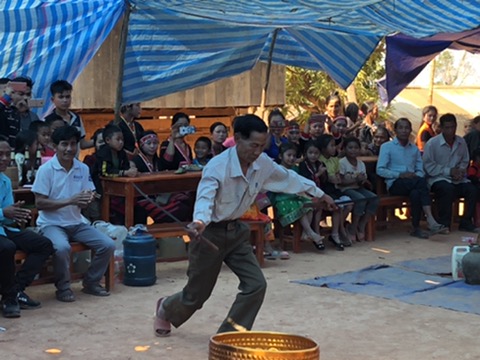 Comme il s'agit aussi d'un moment de réjouissance nous avons le droit a un spectacle d'enfants, tous en tenu traditionnel, les musiques d'ici résonnent sur des caissons de basses branchés à un générateur amener spécialement pour l'occasion. Les enfants entament leur danses traditionnelles et font un vrai show. On est loin du spectacle de kermesse car il s'agit d'honorer les anciennes traditions mais aussi de faire honneur à leur famille devant le gouvernement. Pour ma part je suis reconnaissante de pouvoir découvrir cet univers et j'adore. Une fois fini, un vielle homme a son tour entame une sorte de danse qui fait un peu rituelle avec une fossile dans chaque main, il tourne en rond et fait de spectaculaires mouvements. On se rend compte qu'il rend lui aussi hommage à leur culture, il semble fière de ses exécutions et balance ses bras de droite à gauche. Petit à petit on sent que la fête prend de son essor car l'alcool commence a couler à flot, et encore une fois chacun doit prendre sont shot de Laolao. Cette célébration est l'occasion pour nous d'apprendre à danser à la Laotienne, il faut dire que ce n'est pas si évident que ça. Toutes les danses se passent en tournant en rond autour d'un tronc de bois, tu es face à un homme et tu dois faire des petits pas sur le côté pour avancer, en ce qui concerne les mouvement de bras il y a différentes variantes mais souvent les avant-bras sont a l'horizontales il faut faire un mouvement de balancier et avec les mains paume au dessus puis au dessous. Ca n'a pas l'air difficile comme ça, mais c'est le rythme qui est difficile à avoir car il est trèèèèèès lent ! On essaye de faire au mieux, et apparemment on se débrouille pas si mal car nous recevons des pouces des Laotiens qui se trouve à nos côtés, bon ça les fait bien rigoler quand même de nous voir danser leurs danses. Les soirées sont aussi l'occasion pour les laotiens de faire vibrer leurs cordes vocales, ils ADORENT ça. A croire qu'ils savent tous chanter et connaisse toutes les chansons par coeur. Nous passerons donc la soirée à tourner autour du poteau, j'avoue que j'essaye un maximum d'aller danser ce qui me permet d'éviter le Laolao qui j'ai l'impression me creuse des trous dans l'estomac tellement l'alcool est fort !